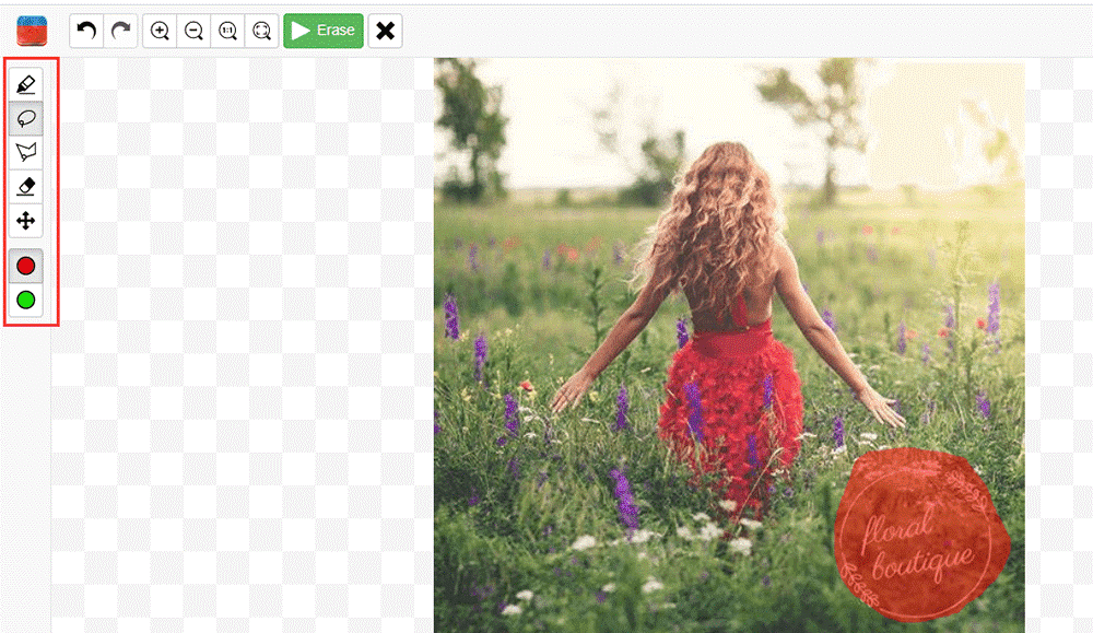 Step 2-click the watermark removal tool in the left menu bar. And frame the location and size of the watermark on the photo and then click on the green “ERASE” option to remove the watermark.