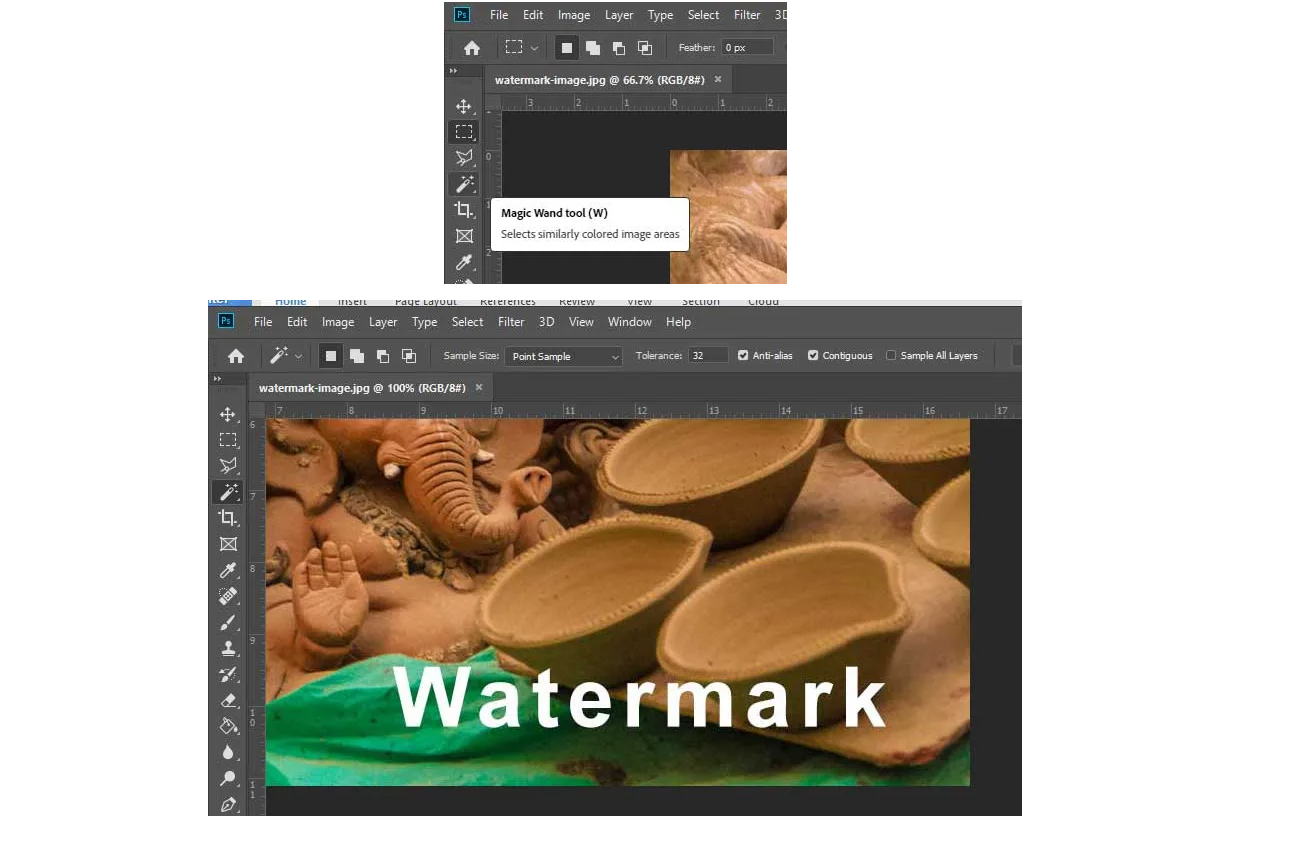 Step 3-now using the Magic wand tool, select the watermarked area to remove the watermarked text.
