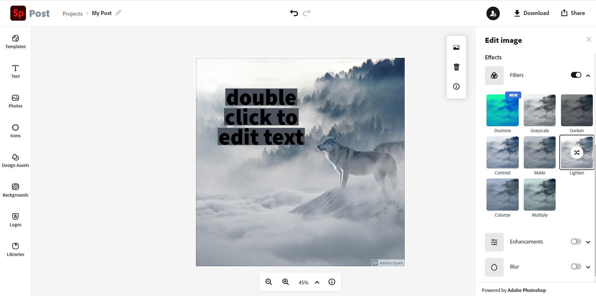 After the selection of the photo, there are many features for enhancing the photo, such as the enhancements, filters, blur, etc. select the filter option for adding a photo filter. There are a decent number of filters available. Some of the filters here include duotone, grayscale, darken, contrast, Matte, lighten, colorize, multiply. To select a filter, just hit the filter button just to activate it, and the filter gets applied. To enhance your image, even more use the other features offered by adobe spark. These features include text insertion features, icons, design assets, backgrounds, logos, and libraries. The main image editing features here include the blur effect, the enhancement mode, etc. After the edits just save your progress and download the photo. There is a share option that links directly to all the social media platforms such as Instagram, Gmail, Facebook, etc. The photo can directly be shared with the media handles directly.